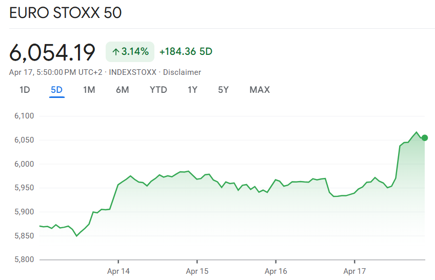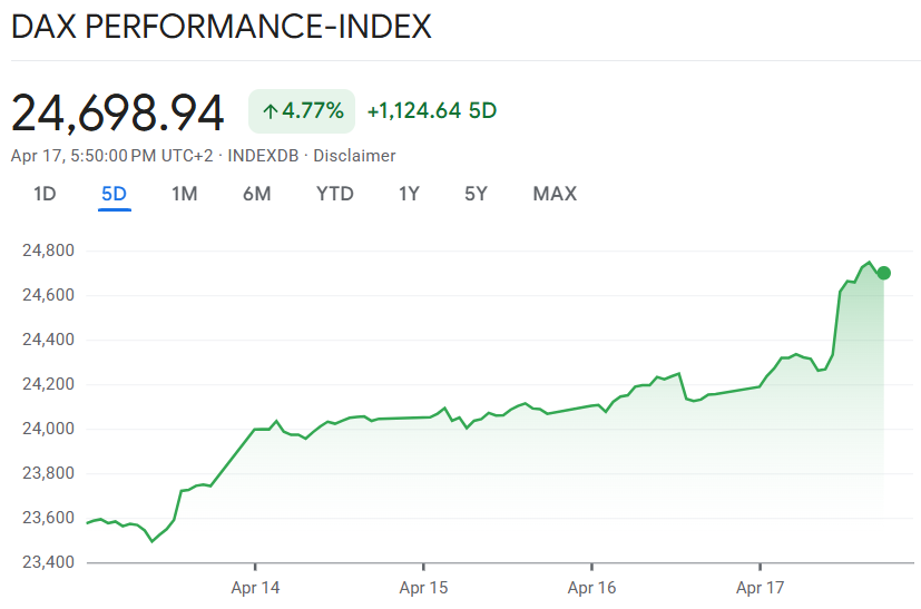 Besonders kraftvoll fiel die Reaktion an den europäischen Aktienmärkten aus. Der Dax sprang um 2,4 Prozent auf 24.734 Punkte nach oben. Auch der EuroStoxx50 legte klar zu und stieg um 1,8 Prozent auf 6.041 Punkte.