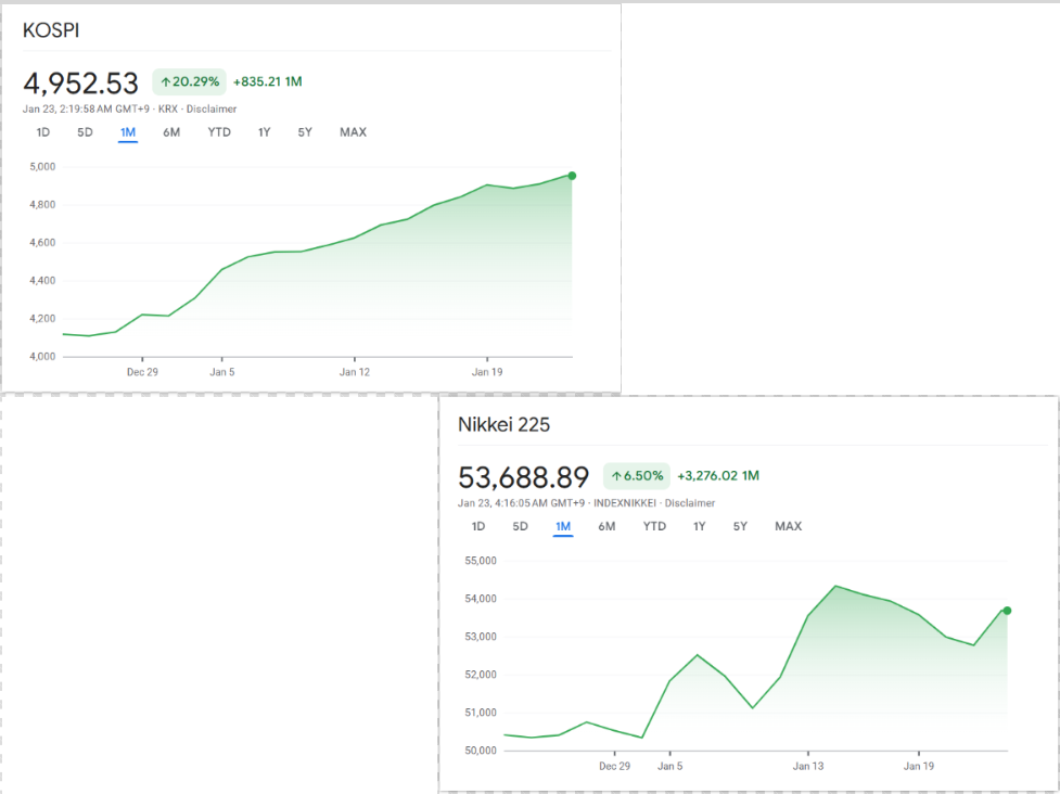 An den Aktienmärkten in Asien ist es zu kräftigen Kursgewinnen gekommen. Auslöser war eine spürbare Mäßigung im Tonfall von Donald Trump, der mehrere zuvor angedeutete Konfliktszenarien öffentlich relativierte. Insbesondere der Verzicht auf neue Zollandrohungen sowie die klare Absage an eine militärische Eskalation im Zusammenhang mit Grönland wurden von Investoren als positives Signal gewertet.