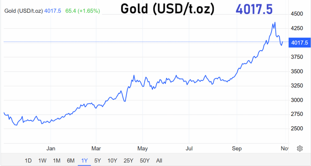 Der Goldpreis hat kurz vor dem mit Spannung erwarteten Zinsentscheid der US-Notenbank (Federal Reserve) deutlich zugelegt und die Marke von 4.000 US-Dollar je Feinunze überschritten. Im späten Handel stieg das Edelmetall um 2,1 Prozent auf 4.018 US-Dollar. Damit setzte sich die Erholung der vergangenen Tage fort, die durch wachsende Zinssenkungserwartungen angetrieben wird.