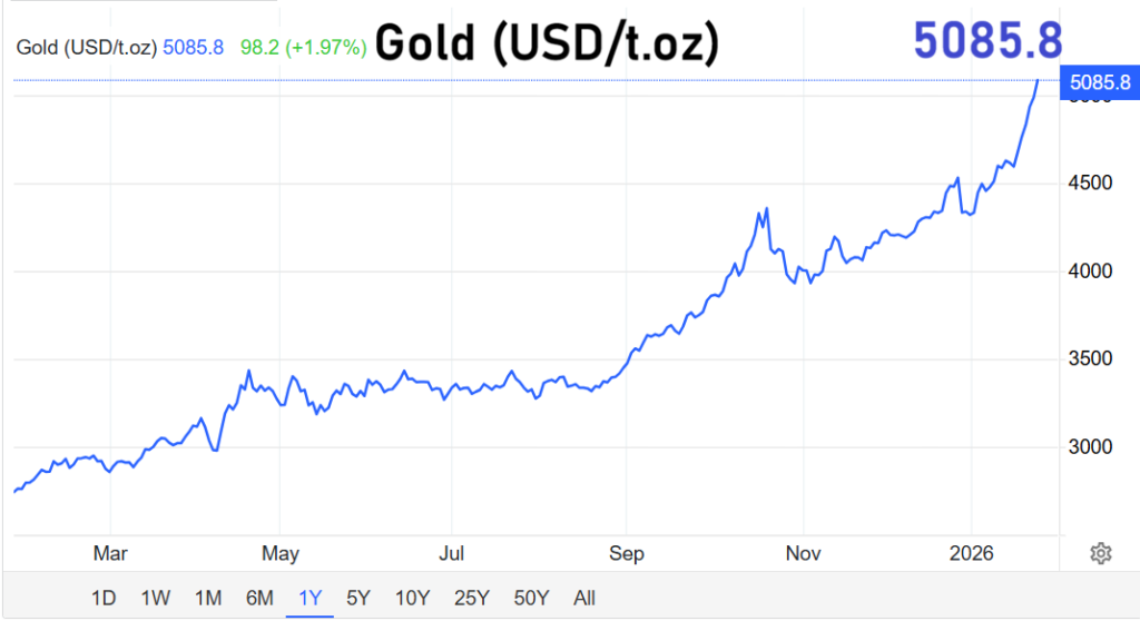 Der Goldmarkt hat eine neue Schallmauer durchbrochen. Zum ersten Mal wurde eine Feinunze Gold oberhalb von 5.000 US-Dollar gehandelt. In der Spitze erreichte der Kurs 5.093 US-Dollar und setzte damit ein deutliches Zeichen an den internationalen Rohstoffmärkten. Was sich seit Monaten abgezeichnet hatte, hat sich nun in rasanter Geschwindigkeit materialisiert: Gold wird erneut zum zentralen Fluchtpunkt für Kapital in einer Welt zunehmender Krisen.