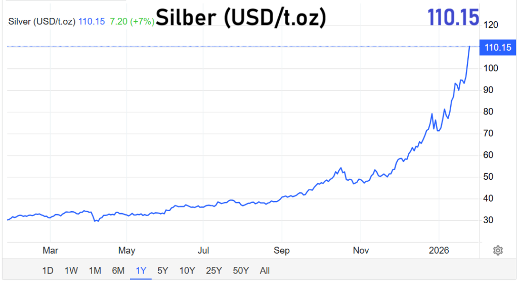 Im Windschatten des Goldbooms erlebt auch Silber eine außergewöhnliche Hausse. Der Preis für eine Feinunze überschritt die Marke von 100 US-Dollar und setzte seinen Aufwärtstrend fort. Während Gold vor allem institutionelle Käufer anzieht, ist Silber bei privaten Investoren besonders beliebt.