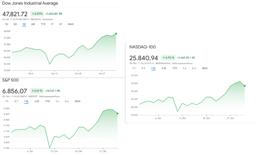 An den US-Börsen herrscht zum Ende der Woche spürbare Zurückhaltung. Nach einer Reihe von Unternehmensberichten aus dem Technologiesektor startete der Dow Jones Industrial Average mit leichten Verlusten und notierte bei 47.588 Punkten. Der S&P 500 sank um rund 0,5 Prozent auf 6850 Punkte, während der Nasdaq Composite mit einem Minus von ein Prozent auf 23.707 Punkte schloss.