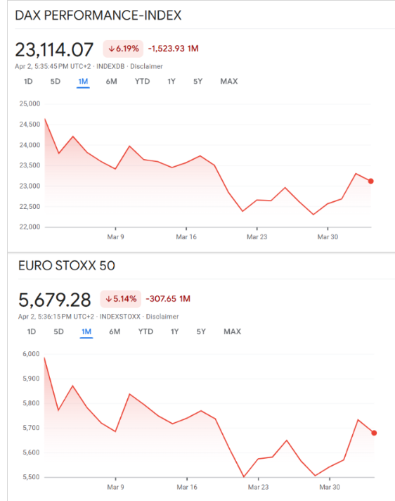 Die Schwäche erfasste nicht nur den deutschen Markt. Der EuroStoxx50, also der zentrale Aktienindex für große europäische Standardwerte, verlor ebenfalls 1,8 Prozent. Mit dem Rückgang auf 5.630 Punkte wurde deutlich, dass die Unsicherheit an den Märkten nicht auf Deutschland begrenzt blieb.