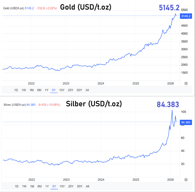 Besonders stark stehen die Rohstoffmärkte unter Spannung. Der Ölpreis reagierte in diesen Tagen beinahe im Stundentakt auf politische Meldungen, militärische Risiken und Spekulationen über Gegenmaßnahmen der USA. Das US-Öl WTI sprang zeitweise um 8,3 Prozent auf 85,42 Dollar je Fass und markierte damit den höchsten Stand seit April 2024. Das Nordseeöl Brent stieg um 5,5 Prozent auf 88,83 Dollar und erreichte ein 23-Monats-Hoch.