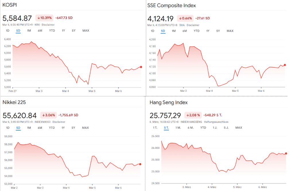Auch in Ostasien hinterließ die Gemengelage aus Krieg, Ölpreis und US-Arbeitsmarktschock Spuren. Allerdings fielen die Reaktionen dort weniger einheitlich aus. Der Kospi in Seoul verlor 0,5 Prozent, der S&P/ASX 200 in Sydney schloss 1,0 Prozent tiefer.
