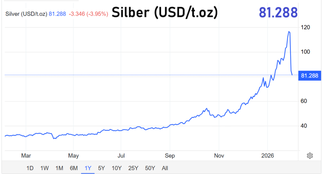 Marktbeobachter sehen in den aktuellen Verlusten auch eine technische Gegenbewegung. Die Rallye zum Jahresbeginn hatte Gold und Silber in kurzer Zeit auf sehr hohe Niveaus getrieben. Die nun erfolgte Korrektur wird daher teilweise als Bereinigung überzogener Erwartungen interpretiert.
