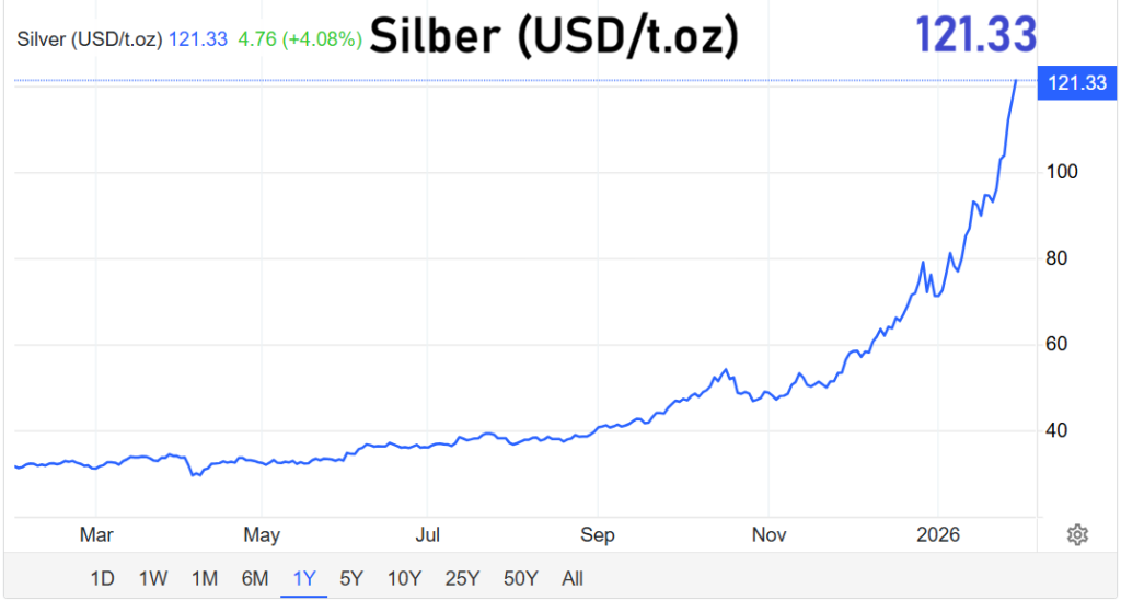 Die internationalen Rohstoffmärkte erleben zu Beginn des Jahres 2026 eine historische Verschiebung. Während Gold neue Rekordmarken erreicht, gerät ein anderes Edelmetall noch stärker in den Fokus: Silber. Innerhalb von nur zwölf Monaten hat sich der Silberpreis um 270 Prozent vervielfacht – ein Tempo, das selbst Gold deutlich hinter sich lässt. Die Gründe dafür liegen tiefer als kurzfristige Spekulation und verweisen auf strukturelle Veränderungen in Wirtschaft, Industrie und Geldordnung.